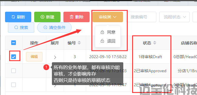 如果做错了,可以退回,库存就会相应回滚。`所有能审核的单据,都有相应的回滚,后面就不在重复讲解了。`